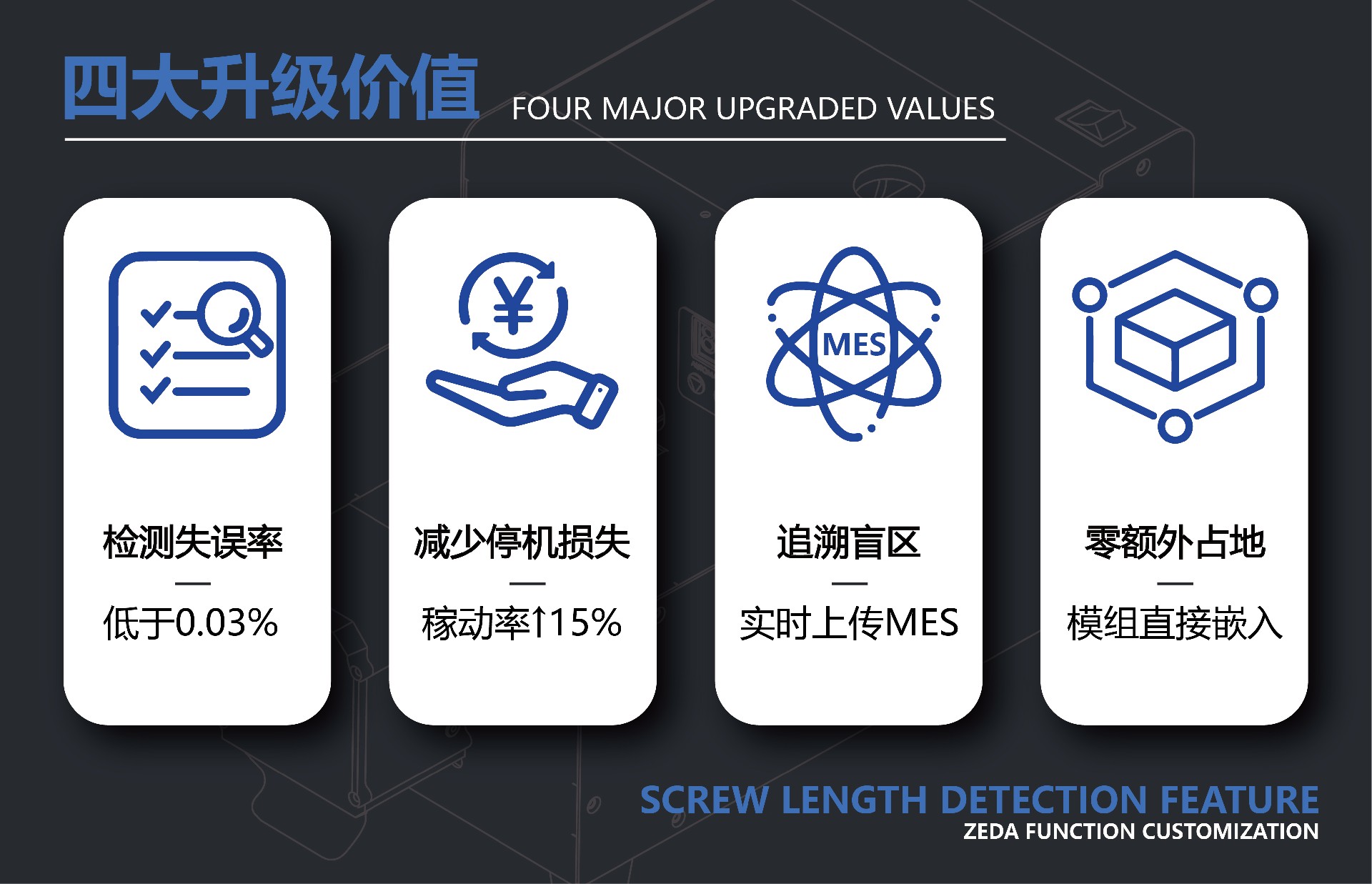 ①檢測失誤率低于0.03%:短螺絲/長螺絲>99.9%攔截,滑牙、卡機、不良螺絲統(tǒng)統(tǒng)說拜拜。